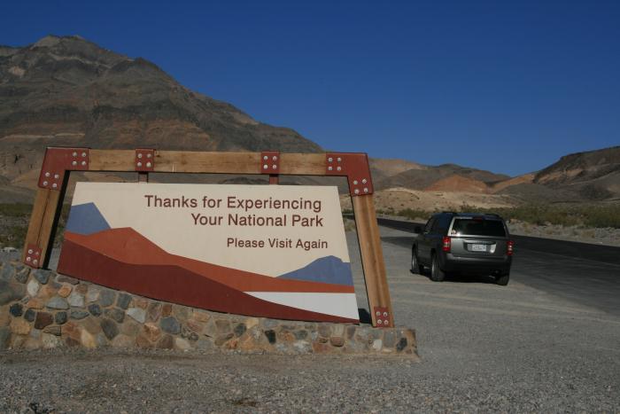 Die Fahrt selbst verlief ziemlich ereignislos. Dann kam das Parkeingangsschild und dort haben wir das obligatorische Foto geschossen und gleichzeitig das zweite Frühstück eingenommen. Um Zeit zu sparen haben wir im Multitasking beides zur gleichen Zeit gemacht.