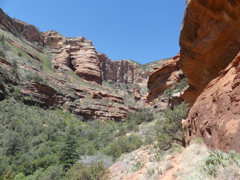 Bei der Recherche hatte ich noch Hinweise bekommen, dass man am Ende des Trails noch etwas Klettern kann und das habe ich getan, in der Annahme, dadurch den Arch zu erreichen. Der restliche Weg war steil, stellenweise eng und ging durchs Gestrüpp. Irgendwann habe ich dann aufgegeben und bin umgedreht. Petra hat am Trailende gewartet, denn Klettern war nun gar nicht ihrs. Hinterher habe ich herausgefunden, dass der Arch auf halber Strecke rechts am Felsen klebt und nur schwer zu erkennen ist. Es sei denn, man schlägt sich dort ins Gebüsch und pirscht sich an die Canyonwand heran. Nun ja, schauen wir ihn uns beim nächsten Mal halt an.
